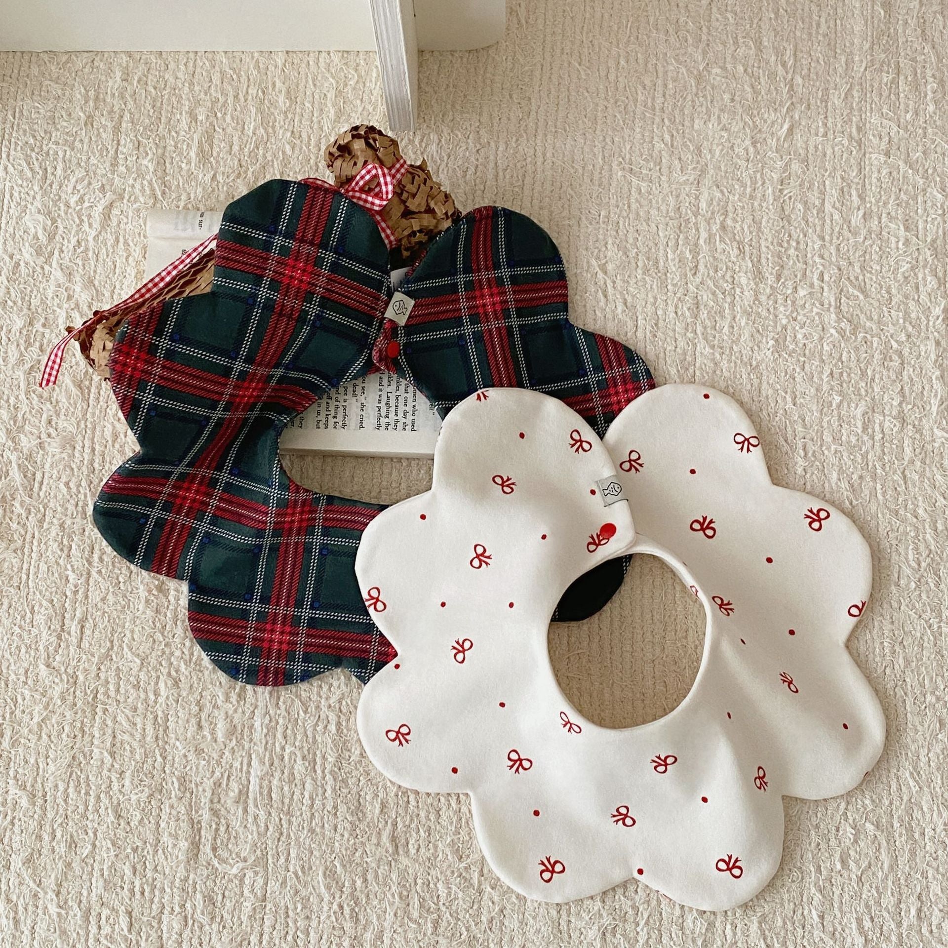 Celebrate the holiday season with our adorable Christmas-themed bib collection! Featuring both round and petal-shaped designs, these reversible bibs combine beautiful floral edges with festive patterns perfect for the winter season.
